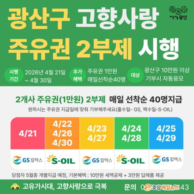 ÁÖÀ¯±Ç 2ºÎÁ¦ Çà»ç´Â ±¤»ê±¸¿¡ 10¸¸ ¿ø ÀÌ»ó ±âºÎÇÑ ±âºÎÀÚ¸¦ ´ë»óÀ¸·Î ¸ÅÀÏ 40¸í¿¡°Ô ¼±Âø¼øÀ¸·Î ÁÖÀ¯±Ç 1¸¸ ¿øÀ» Áö±ÞÇÑ´Ù. ±âºÎ ³¯Â¥¿¡ µû¶ó Ȧ¼öÀÏ¿¡´Â GSĮŨ½º, ¦¼öÀÏ¿¡´Â S-OIL ÁÖÀ¯±ÇÀ» Áö±ÞÇÒ ¿¹Á¤ÀÌ´Ù.