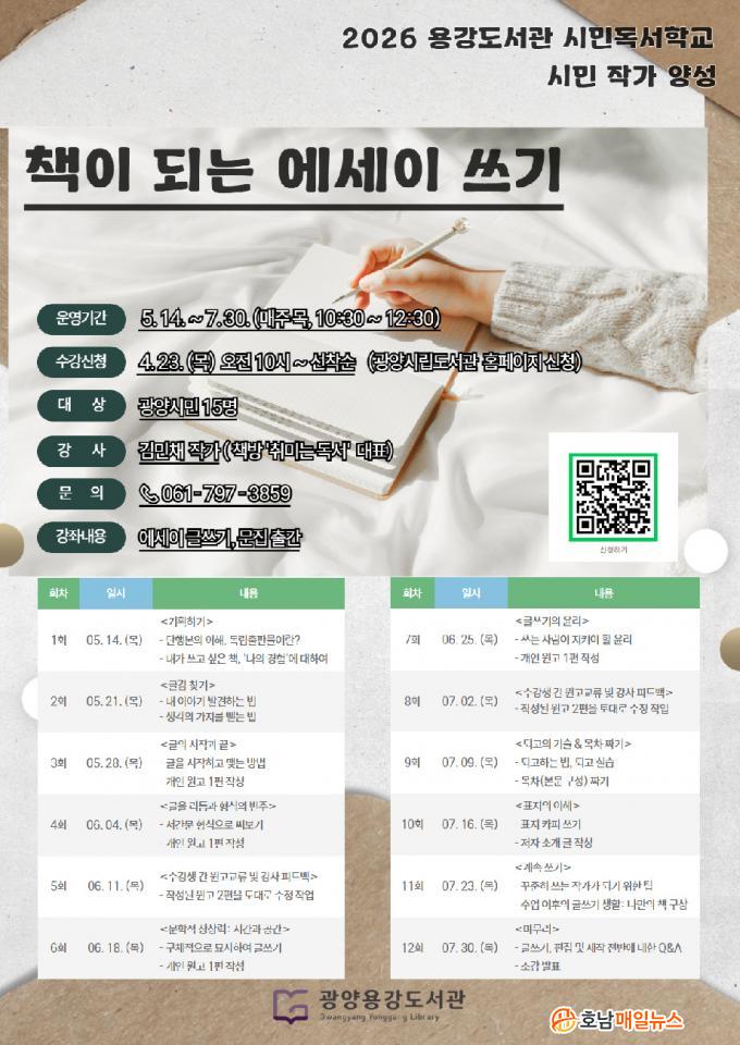 À̹ø ÇÁ·Î±×·¥Àº 5¿ù 14ÀϺÎÅÍ 7¿ù 30ÀϱîÁö ¸ÅÁÖ ¸ñ¿äÀÏ ¿ÀÀü 10½Ã 30ºÐ, ÃÑ 12ȸ °úÁ¤À¸·Î ¿î¿µµÈ´Ù. Âü¿©ÀÚ´Â ÀÚ½ÅÀÇ ÀÏ»óÀ» ¹ÙÅÁÀ¸·Î ¿¡¼¼À̸¦ ÀÛ¼ºÇϰí À̸¦ ÇÑ ±ÇÀÇ Ã¥ ÇüÅ·Π±¸¼ºÇÏ´Â °úÁ¤À» ¹è¿î´Ù.