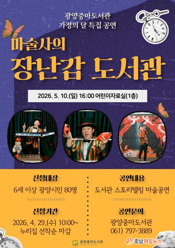 °ø¿¬ °ü¶÷ ½ÅûÀº 4¿ù 29ÀÏ ¿ÀÀü 10½ÃºÎÅÍ ±¤¾ç½Ã¸³µµ¼°ü ´©¸®Áý(https://lib.gwangyang.go.kr)¿¡¼ ¼±Âø¼ø 80¸íÀ» ´ë»óÀ¸·Î Á¢¼öÇϸç, °ü¶÷·á´Â ¹«·á´Ù. ÀÚ¼¼ÇÑ »çÇ×Àº ±¤¾ç½Ã¸³µµ¼°ü ´©¸®ÁýÀ» È®ÀÎÇϰųª ±¤¾çÁ߸¶µµ¼°ü(¢Ï061-797-3889)À¸·Î ¹®ÀÇÇÏ¸é µÈ´Ù.