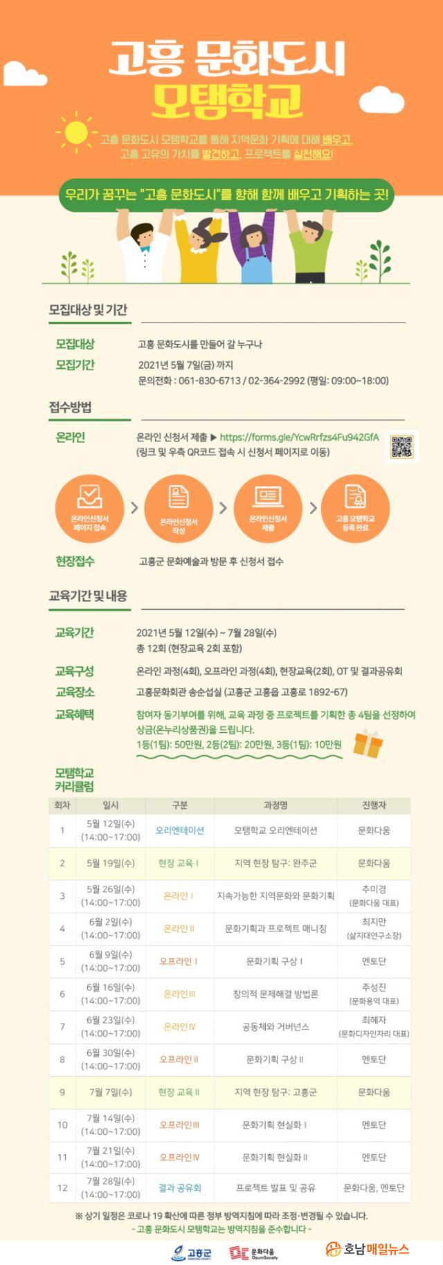 À̹ø ¡®°íÈï ¹®Èµµ½Ã ¸ðÅÆÇб³¡¯´Â °íÈﱺ¹ÎÀÇ ¹®È ¿ª·® °È¸¦ À§ÇØ ±¸¼ºµÈ ¹®È±âȹ Çб³·Î¼ ±³À° ÇÁ·Î±×·¥Àº ÃÑ 12ȸ·Î ¿Â¶óÀÎ ±³À°, ¿ÀÇÁ¶óÀÎ ¿öÅ©¼ó, ÇöÀå ±³À°ÀÌ ÁøÇàµÉ ¿¹Á¤ÀÌ´Ù.