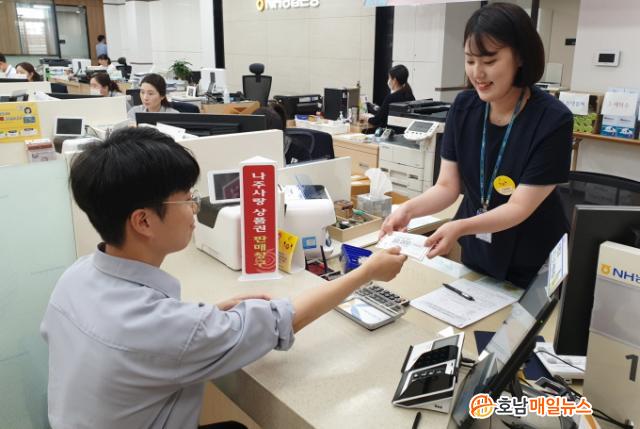 ³ªÁÖ»ç¶û»óǰ±ÇÀº NH³óÇùÀºÇà ³ªÁÖ½ÃÁöºÎ¿Í Áö¿ª³óÇù, ½ÅÇù, »õ¸¶À»±Ý°í, ±¤ÁÖÀºÇà µî ÁöÁ¤ ±ÝÀ¶±â°ü 54°³¼Ò¿¡¼ ¿ù 70¸¸¿ø Çѵµ ³» ±¸¸ÅÇÒ ¼ö ÀÖ´Ù.