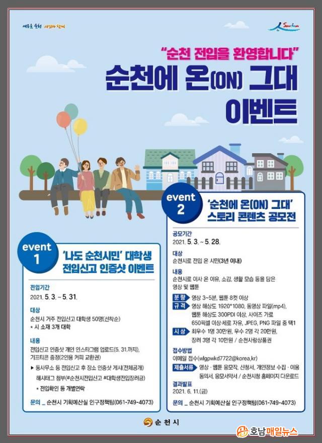 ¼øÃµ¿¡ ¿Â(ON) ±×´ë À̺¥Æ®´Â ¿ø·ë µî¿¡ °ÅÁÖÇÏ´Â ´ëÇлý ¹× Ÿ Áö¿ª¿¡¼ ÀüÀÔÇÏ¿© ¼øÃµ¿¡ Á¤ÂøÇÑ ½Ã¹ÎµéÀÇ ÀÏ»ó°ú ÀüÀÔÇÑ ½ºÅ丮¸¦ °øÀ¯Çϱâ À§ÇØ ±âȹÇÑ °ÍÀ¸·Î ¡®³ªµµ ¼øÃµ½Ã¹Î¡¯, ¡®¼øÃµ¿¡ ¿Â ±×´ë ½ºÅ丮 ÄÜÅÙÃ÷ °ø¸ð¡¯, ¡®¼øÃµÀº óÀ½ÀÌÁÒ ÀüÀԽùΠ´ã¼Ò¡¯ 3ÆíÀ¸·Î ÁøÇàµÈ´Ù.