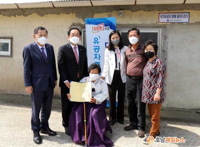 À̳¯ Çà»ç¿¡´Â ±èÁؼº ±º¼ö, ÃÖÀº¿µ ±ºÀÇȸ ÀÇÀå, ¹Ú¿µ¼÷ Àü³²¼ºÎº¸ÈÆÁöûÀåÀÌ Âü¿©ÇÏ¿© µ¶¸³À¯°øÀÚ ¼¼´ë ÀÚ±à½É °íÃ븦 À§ÇØ ¿µ±¤À¾ ´öÈ£¸®¿¡ »ì°íÀÖ´Â µ¶¸³À¯°øÀÚ ¹Ú±â¼ø ¾Ö±¹Áö»çÀÇ Àå³à ¹Ú¼ºÈñ(85¼¼)¾¾ ÀÚÅÃÀ» ¹æ¹®ÇØ ´ëÅë·É¸íÀÇ µ¶¸³À¯°øÀÚ Áõ¼¸¦ Àü¼öÇÏ°í ±¹°¡À¯°øÀÚ ¸íÆÐ ´Þ¾ÆÁÖ¾ú´Ù.