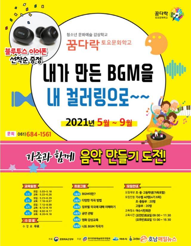 ²Þ´Ù¶ô Åä¿ä¹®ÈÇб³´Â ¡®³»°¡ ¸¸µç BGMÀ» ³» Ä÷¯¸µÀ¸·Î¡¯¶ó´Â ÁÖÁ¦·Î ¿À´Â 22ÀϺÎÅÍ 9¿ù 18ÀϱîÁö 4±â·Î ³ª´² ¸ÅÁÖ Åä¿äÀÏ ¿©¼ö½Ã¹Îȸ°ü¿¡¼ ¹«·á·Î ±³À°ÇÑ´Ù.