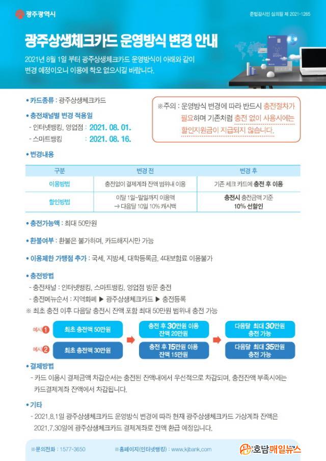 ±¤ÁÖ±¤¿ª½Ã´Â ±âÁ¸ ±¤ÁÖ»ó»ýüũīµå¸¦ »ç¿ëÇÏ¸é ¿¬°á °èÁ¿¡¼ °áÁ¦ ÈÄ 10%¸¦ ȯ±Þ(ij½Ã¹é)ÇØÁÖ´Â ¹æ½Ä¿¡¼, ¿ù 50¸¸¿ø Çѵµ·Î ÃæÀüÇÑ ÈÄ »ç¿ëÇÏ´Â ¹æ½ÄÀ¸·Î º¯°æµÈ´Ù°í 24ÀÏ ¹àÇû´Ù.