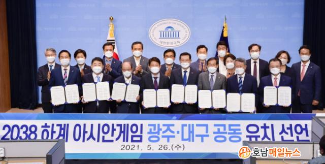 À̿뼷 ±¤ÁÖ±¤¿ª½ÃÀå°ú ±Ç¿µÁø ´ë±¸±¤¿ª½ÃÀåÀº 26ÀÏ ¿ÀÈÄ ±¹È¸ ¼ÒÅë°ü¿¡¼ ¡°¾ç ½Ã¹ÎµéÀÇ ¿°¿øÀ» ¸ð¾Æ ¡®2038 ÇÏ°è ¾Æ½Ã¾È°ÔÀÓ °øµ¿À¯Ä¡¡¯¸¦ À§ÇØ ÇÔ²² ³ë·ÂÇϰڴ١±°í ¹àÇû´Ù.