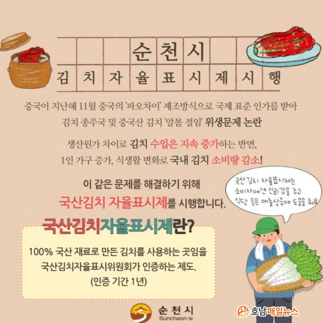 ¼øÃµ½Ã´Â °ª½Ñ ¼öÀÔ»ê ±èÄ¡¸¦ ±¹»ê ±èÄ¡·Î µÐ°©½ÃÄÑ ÆÇ¸ÅÇÏ´Â °ÍÀ» ¸·°í, ¼¼°è ÃÖ°í ǰÁúÀÎ Àü³²»ê ±èÄ¡ÀÇ ¼Òºñ¸¦ Àå·ÁÇϱâ À§ÇØ À½½ÄÁ¡¡¤º´¿ø¡¤Çб³¡¤±èÄ¡ Á¦Á¶¾÷ü¸¦ Á¶»çÇØ 800°÷ÀÇ ±¹»ê±èÄ¡ÀÚÀ²Ç¥½ÃÁ¦ ÀÎÁõÀ» ÃßÁøÇÒ °èȹÀÌ´Ù.