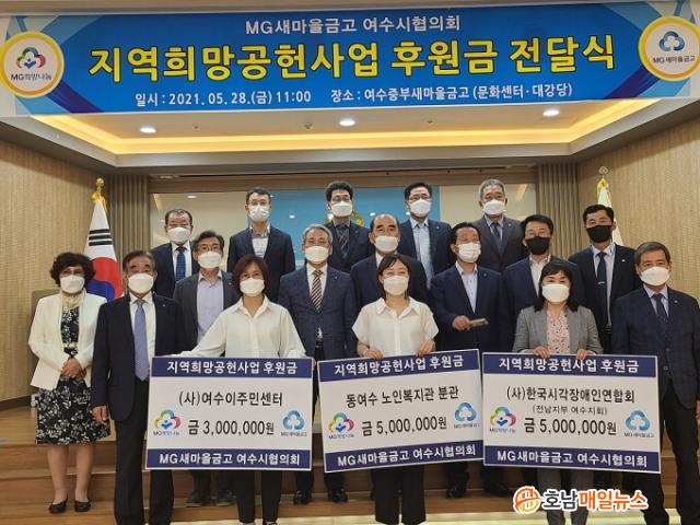 ¿©¼ö½Ã¿¡ µû¸£¸é 28ÀÏ ¿ÀÀü ¿©¼öÁߺλõ¸¶À»±Ý°í ´ë°´ç¿¡¼ Áö¿ª 13°³ »õ¸¶À»±Ý°í ÀÌ»çÀå°ú Áß¾Óȸ ¾È¼¼Âù ÀÌ»ç, ¿©¼ö½Ã °ü°èÀÚ, ¼öÇý´Üü°¡ Âü¼®ÇÑ °¡¿îµ¥ ¡®2021³â Áö¿ªÈñ¸Á°øÇå»ç¾÷¡¯ ÈÄ¿ø±Ý Àü´Þ½ÄÀÌ ¿·È´Ù.