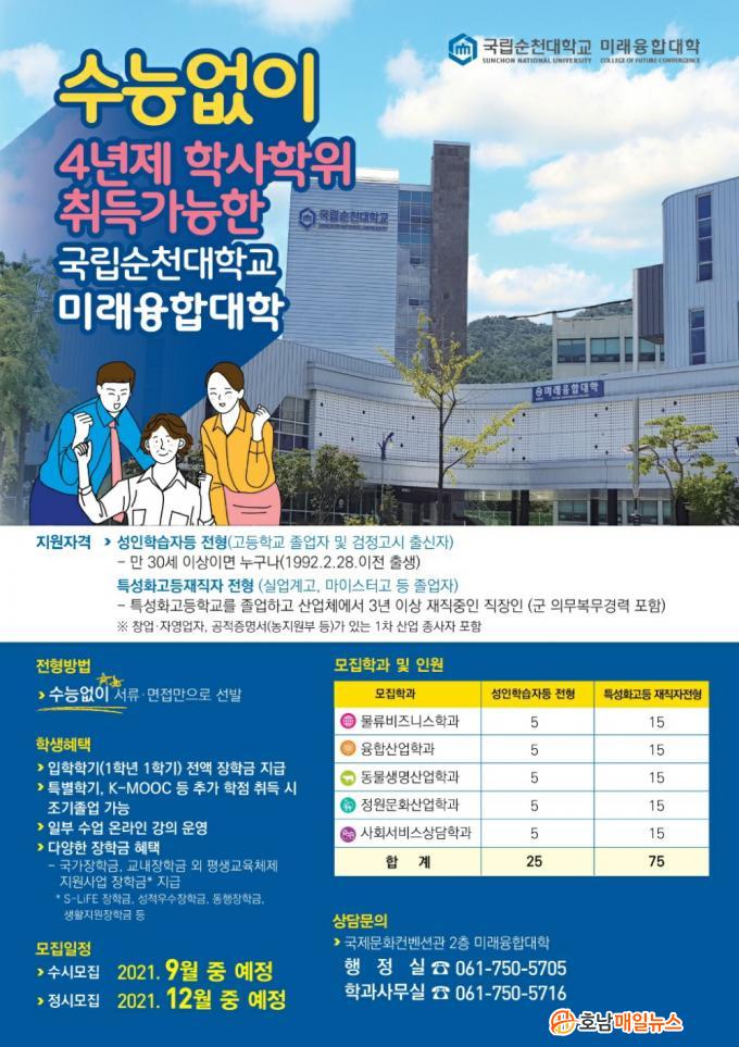 ¼øÃµ´ë ¹Ì·¡À¶ÇÕ´ëÇÐÀº Áö¿ª ¼ºÀÎÇнÀÀÚ¸¦ À§ÇÑ Á¤±Ô ÇлçÇÐÀ§ Ãëµæ°úÁ¤À¸·Î ¹°·ùºñÁî´Ï½ºÇаú, À¶ÇÕ»ê¾÷Çаú, µ¿¹°»ý¸í»ê¾÷Çаú, Á¤¿ø¹®È»ê¾÷Çаú, »çȸ¼ºñ½º»ó´ãÇаú µî 5°³ Çаú¸¦ ¿î¿µÇϰí ÀÖÀ¸¸ç, ¸¸ 30¼¼ ÀÌ»ó °íµîÇб³ Á¹¾÷ÀÚ ¶Ç´Â Ư¼ºÈ°í(½Ç¾÷°è°í)¸¦ Á¹¾÷Çϰí 3³â ÀÌ»ó ÀçÁ÷Çϰí ÀÖ´Â »ç¶÷À» ´ë»óÀ¸·Î ¼ö´É½ÃÇè ¾øÀÌ ¼·ù ¹× ¸éÁ¢À» ÅëÇØ ½ÅÀÔ»ýÀ» ¼±¹ßÇϰí ÀÖ´Ù.