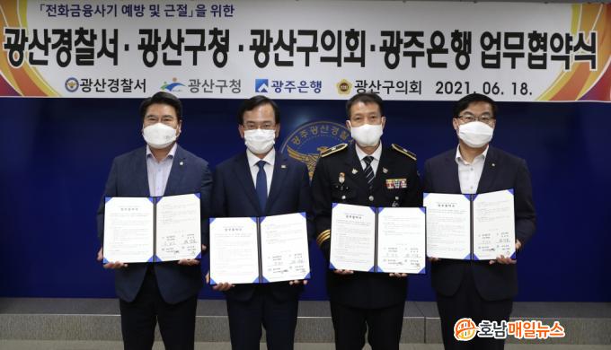 »çÁø¼³¸í=±è»ïÈ£ ±¤»ê±¸Ã»ÀåÀÌ 18ÀÏ ¿ÀÀü ±¤»ê°æÂû¼, ±¤»ê±¸ÀÇȸ, ±¤ÁÖÀºÇà°ú ±ÝÀ¶»ç±â ÇÇÇØ ¿¹¹æ ¾÷¹«Çù¾àÀ» ü°áÇÑ µÚ ±â³ä»çÁøÀ» ÃÔ¿µÇϰí ÀÖ´Ù. ¿ÞÂʺÎÅÍ ¹ÚÇö¼® ±¤»ê±¸ÀÇȸ ºÎÀÇÀå, ±è»ïÈ£ ±¤»ê±¸Ã»Àå, ±è±¤³² ±¤»ê°æÂû¼Àå, À̱¤È£ ±¤ÁÖ