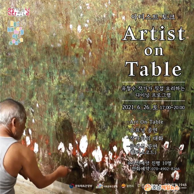 ¡®Art On Table¡¯Àº À¯ ÀÛ°¡°¡ Á÷Á¢ ¿ä¸®¸¦ ÇÏ°í °ü°´µé°ú À½½ÄÀ» ¸Å°³·Î ¼ÒÅëÇÏ´Â ´ÙÀÌ´× ÇÁ·Î±×·¥À¸·Î ¿ÀÇÁ´× °ø¿¬(¹®È¿¹¼úÇùµ¿Á¶ÇÕ Èú·¯½ºÄÚµå ¿¬ÁÖÆÀ ¾Ó»óºíÈú·¯½º)°ú ÅäÅ© ÄܼƮ ÀÛ°¡¿ÍÀÇ ´ëÈ, Ŭ·¡½Ä °ø¿¬ ¼øÀ¸·Î ÀÌ·ç¾îÁø´Ù.