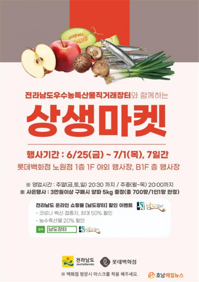 »ó»ýÀåÅÍ´Â 25ÀϺÎÅÍ 7¿ù 1ÀϱîÁö ·Ôµ¥¹éÈÁ¡ ³ë¿øÁ¡ 1Ãþ Á¤¹®°ú ÁöÇÏ 1Ãþ Çà»çÀå¿¡¼ ÆîÃÄÁø´Ù. Àü³²Áö¿ª 24°³ ³ó¾î°¡°¡ Âü¿©ÇØ 300¿© ¿ì¼ö ³ó¼öƯ»ê¹°À» ¼±ºÈ´Ù.