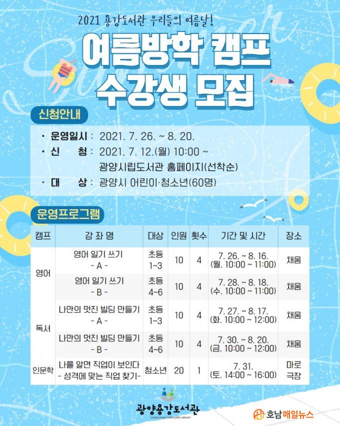 ÇÑÆí, ¿©¸§¹æÇÐ Ä·ÇÁ Âü°¡ ½ÅûÀº 7¿ù 12ÀÏ ¿ÀÀü 10½ÃºÎÅÍ ±¤¾ç½Ã¸³µµ¼°ü ȨÆäÀÌÁö(lib.gwangyang.go.kr)¸¦ ÅëÇØ °¡´ÉÇϸç, ÀÚ¼¼ÇÑ »çÇ×Àº ½Ã¸³µµ¼°ü ȨÆäÀÌÁö¸¦ ¹æ¹®Çϰųª ±¤¾ç¿ë°µµ¼°ü(¢Ï061-797-3857)À¸·Î ¹®ÀÇÇÏ¸é ¾Ë ¼ö ÀÖ´Ù.