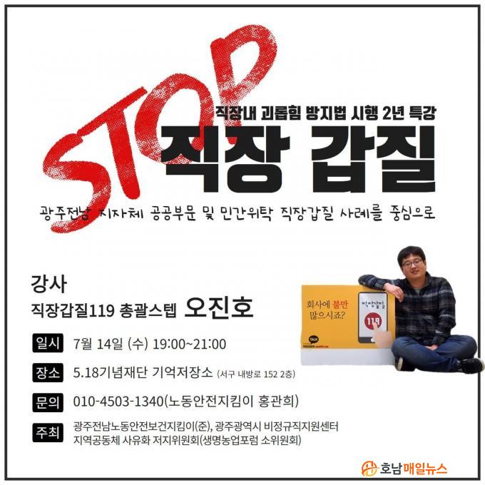 ¡®±¤ÁÖÀü³² ³ëµ¿¾ÈÀüº¸°ÇÁöÅ´ÀÌ¡¯´Â 14ÀÏ 5.18±â³äÀç´Ü ±â¾ïÀúÀå¼Ò¿¡¼ Á÷Àå³» ±«·ÓÈû ¹æÁö¹ý Á¦Á¤ 2ÁÖ³âÀ» ¸Â¾Æ ¡°STOP! Á÷Àå°©Áú¡± Ư°À» °³ÃÖÇÑ´Ù°í ¹àÇû´Ù.