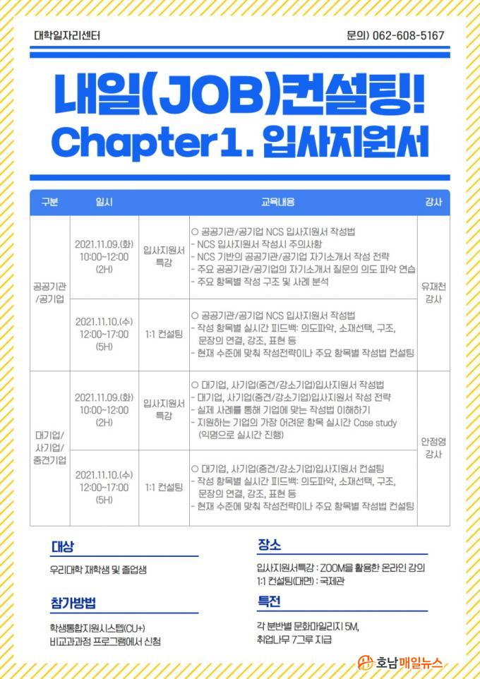 9ÀϺÎÅÍ ¿î¿µµÇ´Â ³»ÀÏ(JOB)ÄÁ¼³ÆÃÀº ÇлýµéÀÇ Ãë¾÷ ½ÇÀü ¿ª·® °È¸¦ À§ÇØ ¸¶·ÃµÆ´Ù. ÄÁ¼³ÆÃÀº °ÀǸ¦ ÅëÇØ ½ÇÁ¦·Î Ãë¾÷¿¡ ÇÊ¿äÇÑ Áö¿ø¼¿Í ¸éÁ¢À» ÇÑ ¹ø¿¡ ÁغñÇÒ ¼ö ÀÖµµ·Ï ±¸¼ºµÆ´Ù.