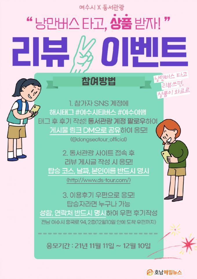 Âü¿© ¹æ¹ýÀº Âü°¡ÀÚ SNS °èÁ¤¿¡ ¡®#¿©¼ö½ÃƼ¹ö½º, #¿©¼ö¿©Ç࡯À» ű×ÇØ üÇè Èı⸦ ÀÛ¼ºÇÑ ÈÄ µ¿¼°ü±¤ °èÁ¤À» ÆÈ·Î¿ìÇÏ¿© °Ô½Ã¹° ¸µÅ©¸¦ Àü¼ÛÇϰųª, µ¿¼°ü±¤ ȨÆäÀÌÁö(http://www.ds-tour.com/) ÀÌ¿ëÈÄ±â °Ô½ÃÆÇ¿¡ ÀÀ¸ðÇÏ¸é µÈ´Ù. °í·É ž½ÂÀÚ Âü¿© µ¶·Á¸¦ À§ÇØ ¿ìÆí Á¢¼öµµ ÁøÇàÇÑ´Ù.
