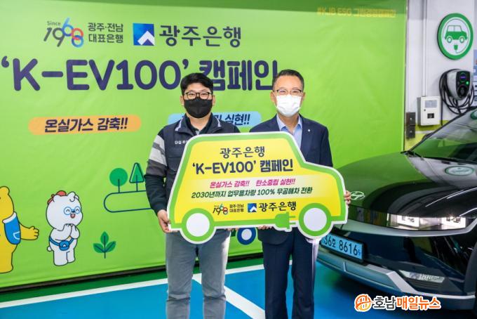 ÀÌ¿¡ ±¤ÁÖÀºÇàÀº ¡®K-EV100¡¯ °¡ÀÔ ¼±Æ÷½ÄÀ» ÅëÇØ Àü±âÂ÷ ÃæÀü½Ã¼³À» ¼³Ä¡Çϰí, ¾÷¹«¿ë ÀÚµ¿Â÷ÀÇ ÀϺθ¦ Àü±âÀÚµ¿Â÷·Î ÀüȯÇÏ¿© ESG °æ¿µ ½Çõ¿¡ ´ëÇÑ °ÇÑ ÀÇÁö¸¦ ¹àÇûÀ¸¸ç, ¾ÕÀ¸·Î ¾÷¹«¿ë ¸ðµç Â÷·®À» ģȯ°æ Àü±âÂ÷·Î ÀüȯÇÏ´Â ÇÁ·ÎÁ§Æ®¸¦ ´Ü°èÀûÀ¸·Î ÁøÇàÇÒ °èȹÀ» ¹ßÇ¥Çß´Ù.