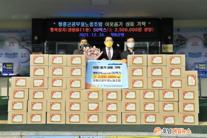 Àü³²µµÃ»°ø¹«¿ø³ëÁ¶´Â ÀåÈﱺÀ» Æ÷ÇÔ 4°³ ÁöÀÚü¸¦ ¼±Á¤, »ýÇÊǰ 11Á¾(Âüġĵ, °í¹«Àå°©, ¼ö¼¼¹Ì, ¹Ùµð¿ö½Ã µî)ÀÌ µé¾î ÀÖ´Â Çູ»óÀÚ 200°³(1õ¸¸ ¿ø »ó´ç)¸¦ ¼ºÅºÀý Àü³¯¿¡ ¼±¹°ÇÏ¿© ÈÆÈÆÇÑ °¨µ¿À» ¾È°Ü ÁÖ¾ú´Ù.