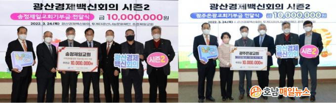 ±¤»ê±¸¿¡ µû¸£¸é 24ÀÏ, ¼ÛÁ¤Á¦Àϱ³È¸¿Í ±¤ÁÖÀº±¤±³È¸°¡ °¢°¢ 1õ¸¸ ¿øÀ» Åõ°Ô´õ±¤»ê³ª´®¹®ÈÀç´Ü¿¡ ±âŹÇß´Ù. ±âʱÝÀº ±¤»ê°æÁ¦¹é½ÅȸÀÇ·Î Àü´ÞµÈ´Ù.