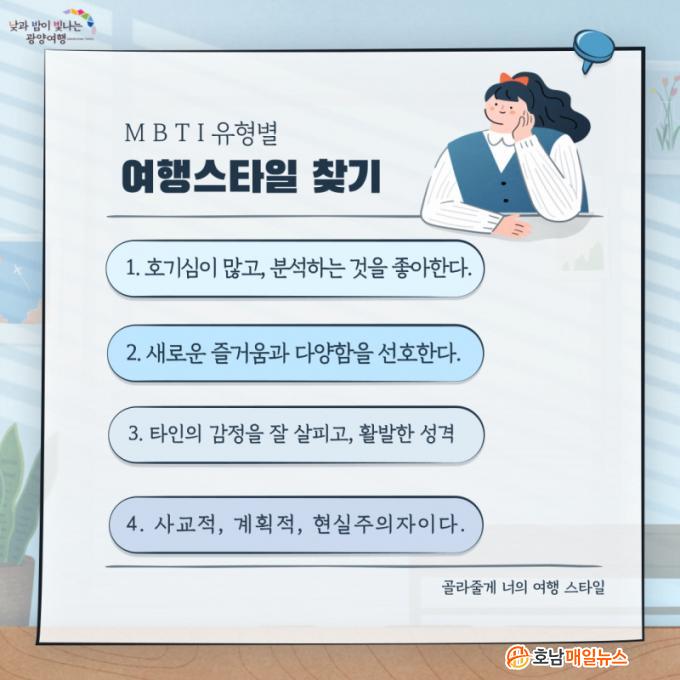 ¼º°ÝÀ¯Çüº°(MBTI) °Ë»ç°á°ú¸¦ ÅëÇØ º»ÀÎÀÇ ¼º°ÝÀ» ±¸º°ÇÑ µÚ À¯Çü¿¡ ¸Â´Â °ü±¤Áö ¹æ¹®À» ÅëÇØ ¸ÂÃãÇü °ü±¤À» Áñ±æ ¼ö ÀÖµµ·Ï ¿î¿µÇÑ´Ù. ¼º°ÝÀ¯Çüº° °ü±¤Áö´Â ºÐ¼®Çü, ŽÇè°¡Çü, ¿Ü±³Çü, °ü¸®ÀÚÇü µî 4°¡Áö ºÐ·ù·Î ³ª´² ¿©ÇàÀ» °æÇèÇÒ ¼ö ÀÖ´Ù.