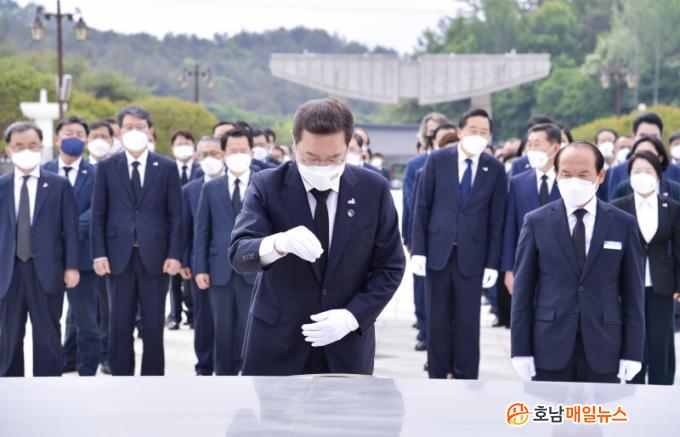 [È£³²¸ÅÀÏ´º½º] À̿뼷 ±¤ÁÖ±¤¿ª½ÃÀå°ú ±è¿ëÁý ±¤ÁÖ½ÃÀÇȸ ÀÇÀå µî ÇÕµ¿Âü¹è´ÜÀÌ Á¦42ÁÖ³â 5¡¤18¹ÎÁÖȿ ±â³äÀÏÀ» ¾ÕµÎ°í 12ÀÏ ¿ÀÀü ºÏ±¸ ¿îÁ¤µ¿ ±¹¸³5¡¤18¹ÎÁÖ¹¦Áö¸¦ Âü¹èÇß´Ù.