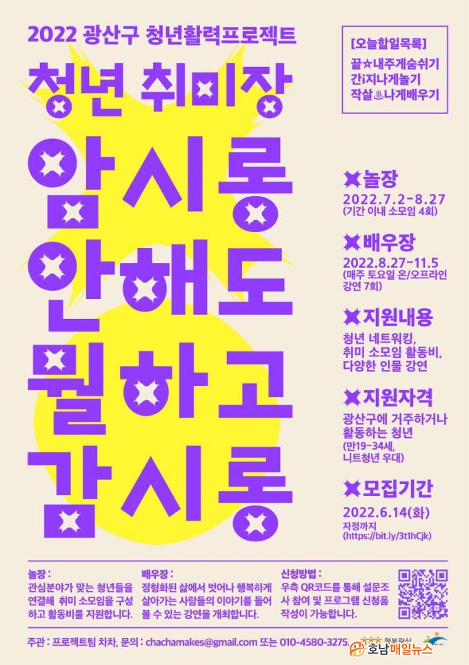 ¸ðÁý ´ë»óÀº ±¤»ê±¸¿¡ °ÅÁÖÇϰųª Ȱµ¿Çϴ û³â(¸¸19~34¼¼)À¸·Î, 14ÀϱîÁö ¿Â¶óÀÎ Æû(https://bit.ly/3t1hCjk)¿¡ Á¢¼ÓÇØ ½Åû¼¸¦ ÀÛ¼º, Á¦ÃâÇÏ¸é µÈ´Ù.(À¥Æ÷½ºÅÍ QRÄÚµå ÀÌ¿ë °¡´É)