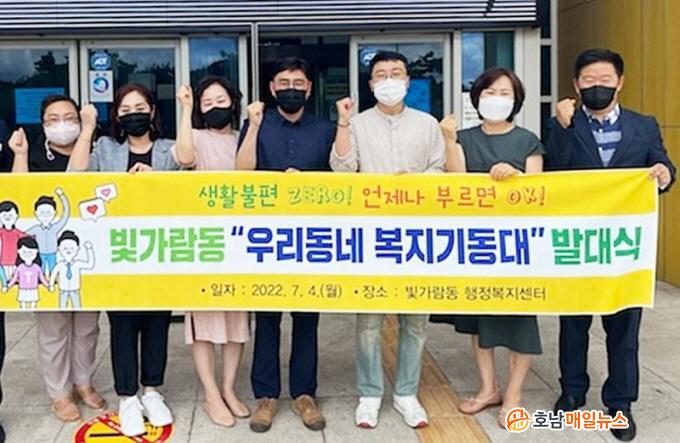 ºû°¡¶÷µ¿ º¹Áö±âµ¿´ë´Â °øµ¿ÁÖÅà °ü¸®¼ÒÀå, º¹ÁöȰµ¿°¡, ÅëÀå, ÁÖ¹ÎÀÚÄ¡À§¿ø µîÀÌ Æ÷ÇÔµÈ ÀηÂÀ» È®ÃæÇϰí ÃÖ±Ù »õ Ãâ¹ßÀ» À§ÇÑ ¹ß´ë½ÄÀ» °¡Á³´Ù. °¢°è°¢Ãþ ÁֹΠ10¸íÀ¸·Î ±¸¼ºµÈ º¹Áö±âµ¿´ë´Â º¹ÁöÀÎÀû¾ÈÀü¸Á ±¸ÃàÀ» ¸ñÇ¥·Î º¹Áö»ç°¢Áö´ë ¹ß±¼, Ãë¾à°èÃþ ¾ÈºÎ»ìÇDZâ, ÁÖ°Åȯ°æ°³¼± µî µµ¿òÀÇ ¼Õ±æÀÌ ÇÊ¿äÇÑ ¾î·Á¿î ÀÌ¿ôÀ» À§ÇØ ´Ù¹æ¸éÀÇ ºÀ»ç Ȱµ¿¿¡ ÆÈÀ» °È¾îºÙÀÏ ¿¹Á¤ÀÌ´Ù.