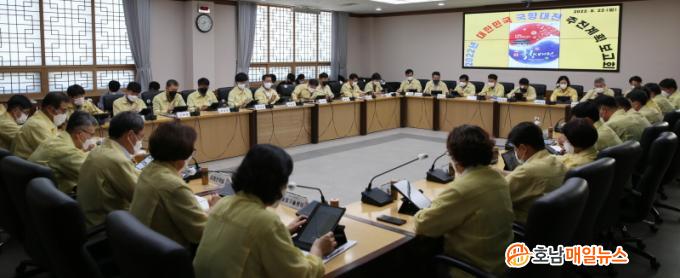 ÇÔÆò±ºÀº 22ÀÏ ¡°¡®2022 ´ëÇѹα¹ ±¹Çâ´ëÀü¡¯ ÃßÁø°èȹ º¸°íȸ°¡ À̳¯ ¿ÀÀü ±ºÃ» ¼ÒȸÀǽǿ¡¼ ¿·È´Ù¡±°í ¹àÇû´Ù. ÀÌ»óÀÍ ±º¼ö ÁÖÀç·Î ¿¸° À̳¯ º¸°íȸ´Â ½Ç°ú¼ÒÀå, À¾¸éÀå µîÀÌ Âü¼®ÇÑ °¡¿îµ¥ ÃàÁ¦ Àü¹Ý¿¡ °ÉÃÄ ÃßÁø°èȹ°ú ¿î¿µ¹æ¾È µîÀ» ½Éµµ ÀÖ°Ô ³íÀÇÇß´Ù.