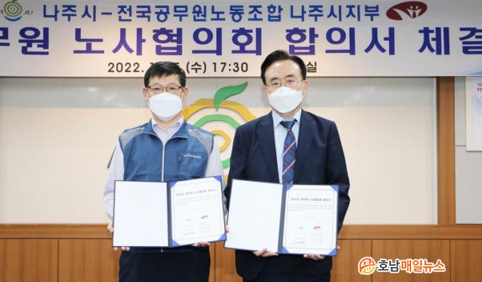 ³ªÁÖ½Ã(½ÃÀå À±º´ÅÂ)´Â Áö³ 5ÀÏ ½Ãû»ç ÀÌȽǿ¡¼ °ø¹«¿ø³ëÁ¶ ³ªÁÖ½ÃÁöºÎ(ÁöºÎÀå ÀÓÁø±¤)¿Í ¡®2022³â °ø¹«¿ø ³ë»çÇùÀÇȸ ÇÕÀǼ¡¯¸¦ ü°áÇß´Ù°í 6ÀÏ ¹àÇû´Ù.