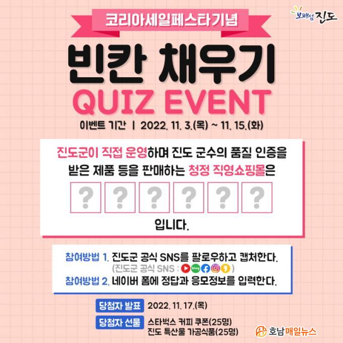 Áøµµ±º ±âȹ¿¹»ê°ú °ü°èÀÚ´Â ¡°Çѱ¹ÆÇ ºí·¢ÇÁ¶óÀ̵¥ÀÌÀÎ ÄÚ¸®¾Æ¼¼ÀÏÆä½ºÅ¸¸¦ ¸Â¾Æ Áøµµ±º ¼îÇθô È«º¸¸¦ À§ÇØ À̺¥Æ®¸¦ ½Ç½ÃÇÑ´Ù¡±¸ç ¡°¾ÕÀ¸·Îµµ ¿Â¶óÀÎ ¼îÇθô Ȱ¼ºÈ¸¦ À§ÇØ SNS¸¦ ÅëÇØ ´Ù¾çÇÑ À̺¥Æ®¸¦ ½Ç½Ã, º¸¹è¼¶ Áøµµ±º¿¡¼ »ý»êµÈ ³ó¼öƯ»êǰÀÇ ¿ì¼ö¼ºÀ» ³Î¸® ¾Ë¸®´Âµ¥ ³ë·ÂÇϰڴ١±°í ¸»Çß´Ù.