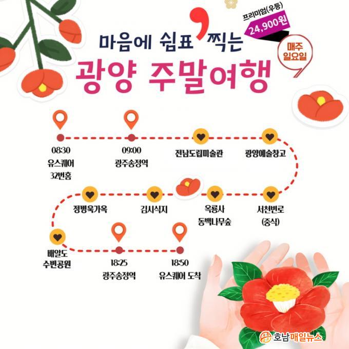 ±¤¾çÁÖ¸»¿©ÇàÀº ¸ÅÁÖ ÀÏ¿äÀÏ ±¤ÁÖ À¯½ºÄù¾î(8½Ã 30ºÐ)¸¦ Ãâ¹ßÇØ ±¤ÁÖ¼ÛÁ¤¿ª(9½Ã)À» °æÀ¯ÇØ ±¤¾ç ¿øµµ½ÉÀÇ Àü³²µµ¸³¹Ì¼ú°ü, ±¤¾ç¿¹¼úâ°í µîÀ» °ü¶÷ÇÑ´Ù.
