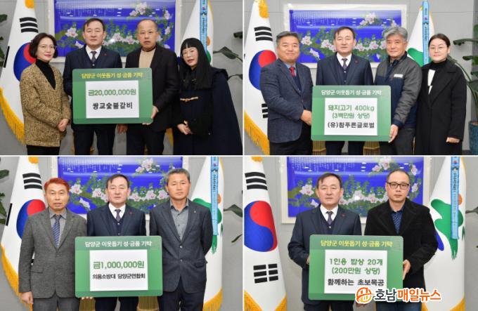 13ÀÏ¿¡´Â ½Ö±³½¡ºÒ°¥ºñ(´ëÇ¥ ±èâȸ) Çö±Ý 2,000¸¸¿ø, ³ó¾÷ȸ»ç¹ýÀÎ (À¯)ÂüǪ¸¥±Û·Î¹ú(´ëÇ¥ ¼Û¼®Âù) 300¸¸¿ø »ó´ç µÅÁö°í±â 400kg, ÇÔ²²ÇÏ´Â Ãʺ¸¸ñ°ø ¹êµå(Àü³²±¤ÁÖÁöºÎÀå Á¤Ã¢¿ì) 1ÀÎ¿ë ¹ä»ó 20°³(200¸¸¿ø »ó´ç) ÀÇ¿ë¼Ò¹æ´ë ´ã¾ç±º¿¬ÇÕȸ(¿¬ÇÕȸÀå ¹èµ¿°ü) Çö±Ý 100¸¸¿ø µî ¸¹Àº °÷¿¡¼ µû¶æÇÑ ¸¶À½À» ÀüÇß´Ù.
