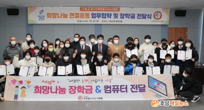 ÀÌ Çù¾à¿¡ µû¶ó »ç´Ü¹ýÀÎÀº °íÈﱺ¿¡ 2³â°£ ÃÑ 2¾ï 2,280¸¸¿ø »ó´çÀÇ ÀåÇбݰú ¹°Ç°À» Áö¿øÇÏ°Ô µÇ¸ç, ±× Áß 1,800¸¸¿øÀÇ ÀåÇбݰú 240¸¸¿ø »ó´çÀÇ ÄÄÇ»Å͸¦ À̹ø Çù¾à½Ä¿¡¼ °ü³» 19¸íÀÇ Çлý¿¡°Ô Á÷Á¢ Àü´ÞÇß´Ù.