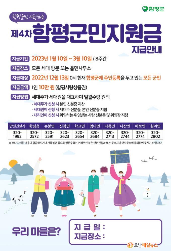 ÇÔÆò±ºÀº ¡°Àü ±º¹Î¿¡°Ô 1Àδç 10¸¸¿ø¾¿ 31¾ï¿ø ±Ô¸ðÀÇ Á¦4Â÷ ±º¹ÎÀç³Áö¿ø±ÝÀ» ÇÔÆò»ç¶û»óǰ±ÇÀ¸·Î Áö±ÞÇÑ´Ù¡±°í 4ÀÏ ¹àÇû´Ù. Áö±Þ´ë»óÀº 2022³â 12¿ù 13ÀÏ ±âÁØ ÇÔÆò±º¿¡ ÁÖ¼Ò¸¦ µÐ ±º¹ÎÀ̸ç, Áö±Þ±â°£Àº ³»³â 1¿ù 10ÀϺÎÅÍ 3¿ù 10ÀϱîÁö 8ÁÖ°£ÀÌ´Ù.