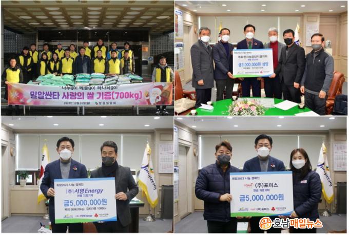 ¸ÕÀú, ÀÌ¿ô »ç¶ûÀ» ´ãÀº ¹°Ç° ±âŹÀÌ Ç³¼ºÇÏ´Ù. À强¹Ð¾Ëȸ(ȸÀå ±èÁ¾¼®)°¡ ¹é¹Ì 700kgÀ» ¸¶·ÃÇØ ÀÌ¿ô¿¡°Ô Á÷Á¢ Àü´ÞÇÏ°í ¾ÈºÎ¸¦ »ìÆñÀ¸¸ç, ¢ß¼¿µ¿¡³ÊÁö(´ëÇ¥ ±è¾ç±Ç)µµ 20kgµéÀÌ ¹é¹Ì 50Æ÷¿Í ¶ó¸é 100¹Ú½º¸¦ ÀüÇß´Ù. µ¿È¸é ÀüÀÚ³ó°ø´ÜÁöÇùÀÇȸ¿¡¼´Â Ãß¿î °Ü¿ïÀ» ´ëºñÇØ Àü±âÀåÆÇ 40°³¸¦ ÀÌ¿ôµéÀ» À§ÇØ ±âŹÇß´Ù.