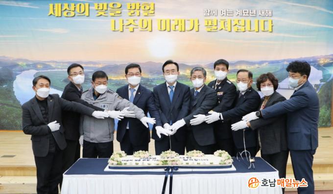 À̳¯ ½Å³âÀλçȸ Âü¼®ÀÚ ´ëÇ¥µéÀº ¡®¼¼»óÀÇ ºûÀÌ ¹àÈú ³ªÁÖÀÇ ¹Ì·¡¸¦ À§ÇÏ¿©¡¯¶ó´Â ¹®±¸¸¦ »õ±ä ¶± ÄÉÀÌÅ© Ä¿ÆÃ½ÄÀ» °®°í ³ª´©¸ç ³ªÁÖÀÇ Èñ¸ÁÂù ¹Ì·¡¸¦ ±â¿øÇß´Ù.
