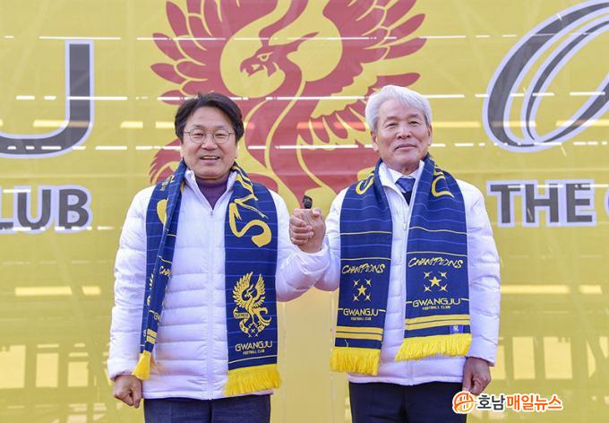 ±¸´ÜÁÖÀÎ °±âÁ¤ ±¤ÁÖ½ÃÀåÀº ¡°±¤ÁÖFCÀÇ ¸ñÇ¥´Â ´ç¿¬È÷ ¿ì½ÂÀ̰ÚÁö¸¸, ¿ì½Â ÀÌÀü¿¡ ÆÒµé·ÎºÎÅÍ ¿±¤Àû »ç¶ûÀ» ¹Þ¾Æ¾ß ÇÑ´Ù¡±¸ç ¡°½Ã¹Î±¸´ÜÀÎ ±¤ÁÖFC°¡ °øµ¿Ã¼ÀÇ ´ÜÇÕ°ú ±âȸ‧¼ºÀåÀÇ ±¤ÁÖ¸¦ ¸¸µå´Âµ¥ ¾ÕÀå¼ ÁÖ±æ ¹Ù¶õ´Ù¡±°í °Ý·ÁÇß´Ù.