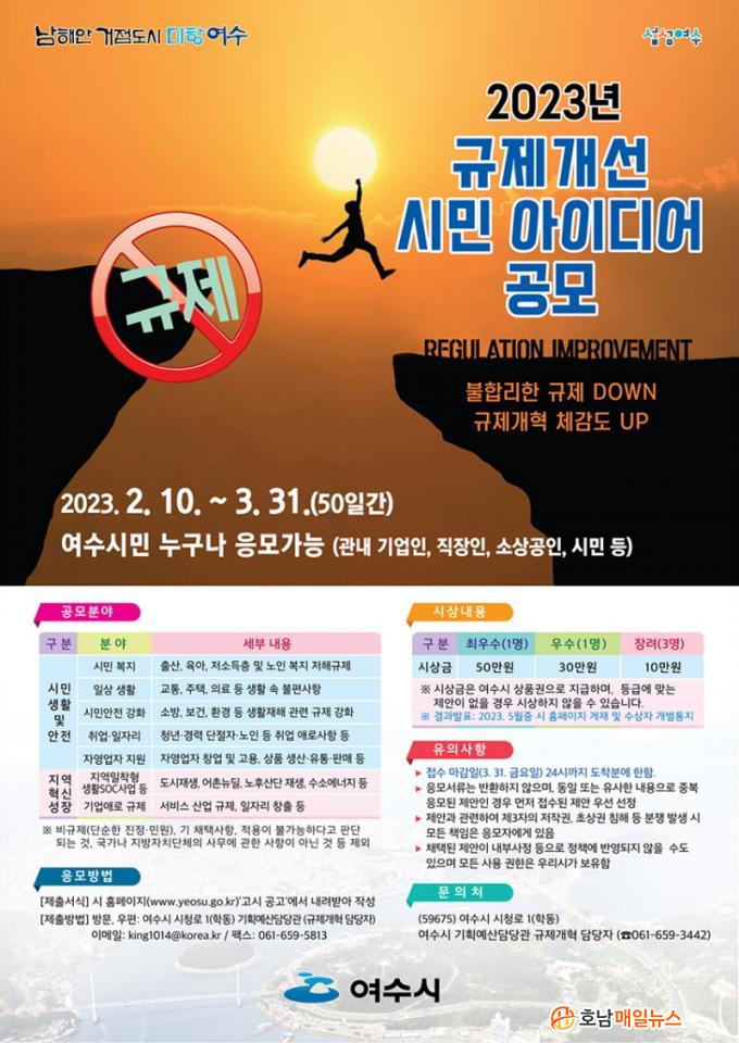 °ø¸ð´Â ¿À´Â 10ÀϺÎÅÍ 3¿ù 31ÀϱîÁö ¿©¼ö½Ã¹Î ´©±¸³ª ÀÏ»ó»ýȰ¿¡ ¼û¾îÀÖ´Â ºÒÇÕ¸®ÇÑ ±ÔÁ¦¿Í ±â¾÷ Ȱµ¿À» ÀúÇØÇÏ´Â ±ÔÁ¦ µî¿¡ ´ëÇÑ ¾ÆÀ̵ð¾î¸¦ ÀÀ¸ðÇÏ¸é µÈ´Ù. °ø¸ð´Â ½Ã¹Î»ýȰ ¹× ¾ÈÀü ºÐ¾ß¿Í Áö¿ªÇõ½Å ¼ºÀå, µÎ °³ ºÐ¾ß·Î ÃßÁøµÈ´Ù.