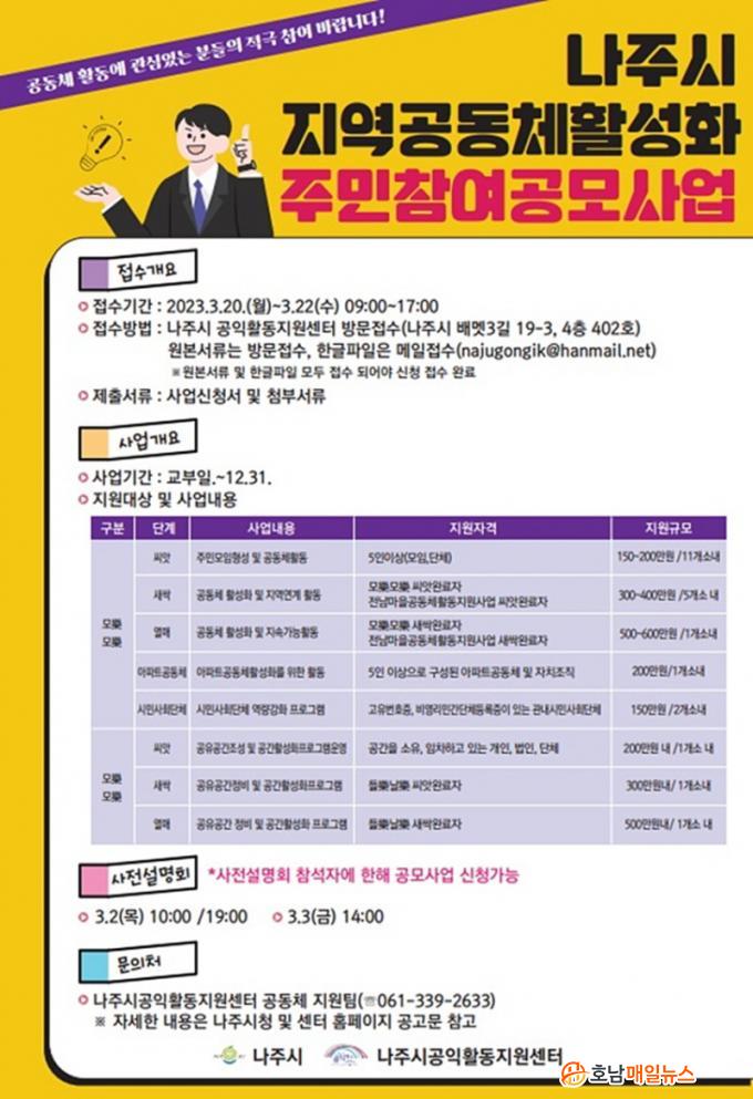 ¿ÃÇØ´Â 20°³¼Ò ³»¿Ü¿¡¼ ÃÑ »ç¾÷ºñ 6300¸¸¿øÀ» Áö¿øÇÑ´Ù. »ç¾÷ ½Åû ÀÚ°ÝÀº »çÀü¼³¸íȸ¿¡ Âü¼®ÇÑ ÁÖ¹Î(°øµ¿Ã¼)¿¡ ÇÑÇØ ÁÖ¾îÁø´Ù. »çÀü¼³¸íȸ´Â 3¿ù 2ÀÏ(¿ÀÀü 10½Ã, ¿ÀÈÄ 7½Ã), 3¿ù 3ÀÏ(¿ÀÈÄ 2½Ã) ÃÑ 3ȸ¿¡ °ÉÃÄ ³ªÁֽðøÀÍȰµ¿Áö¿ø¼¾ÅÍ(³ªÁֽà ¹è¸ä3±æ 19-3¡¤4Ãþ)¿¡¼ ¿¸°´Ù.