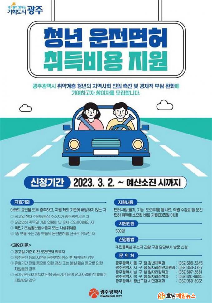 Áö¿ø ´ë»óÀº °ø°íÀÏ(2¿ù23ÀÏ)ºÎÅÍ Áֹεî·Ï»ó ÁÖ¼ÒÁö°¡ ±¤ÁÖ½ÃÀ̰í, ¿îÀü¸éÇã ÃëµæÀÏ ±âÁØ ¿¬·ÉÀÌ ¸¸19~39¼¼ÀÎ ±¹¹Î±âÃÊ»ýȰº¸Àå ¼ö±ÞÀÚ ¶Ç´Â Â÷»óÀ§ °èÃþ û³â Áß 1Á¾ º¸Åë ¶Ç´Â 2Á¾ º¸ÅëÀÇ ¿îÀü¸éÇ㸦 ½Å±Ô·Î ÃëµæÇϴ û³âÀÌ´Ù.