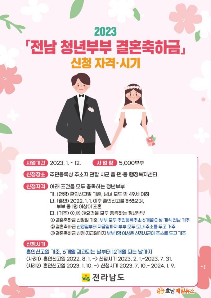 ¿¹¸¦ µé¾î ½ÅûÇÑ ³¯ºÎÅÍ ºÎºÎ ¸ðµÎ°¡ Àü³²¿¡ °ÅÁÖÇÏ°í ºÎºÎ Áß 1¸í ÀÌ»óÀº °áÈ¥ÃàÇϱÝÀ» ½ÅûÇÑ ÇØ´ç ½Ã±º¿¡ °è¼ÓÇØ °ÅÁÖÇϰí ÀÖ´Ù¸é ½ÅûÇÑ ´ÞÀÇ ´ÙÀ½ ´Þ 10ÀÏ °áÈ¥ÃàÇÏ±Ý 200¸¸ ¿øÀ» ¹ÞÀ» ¼ö ÀÖ´Ù. ÀÚ¼¼ÇÑ »çÇ×Àº Àü³²µµ³ª ½Ã±º ´ëÇ¥ ´©¸®Áý °ø°í¹®À» ÅëÇØ È®ÀÎÇÒ ¼ö ÀÖ´Ù.