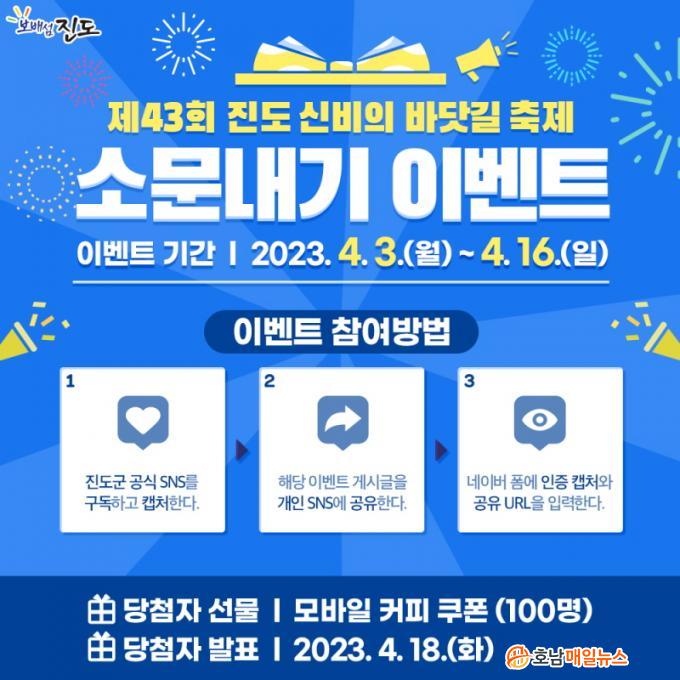 SNS ¼Ò¹®³»±â À̺¥Æ®´Â 4¿ù 20ÀϺÎÅÍ Áøµµ±º¿¡¼ °³ÃֵǴ Áøµµ ½ÅºñÀÇ ¹Ù´å±æ ÃàÁ¦ À̺¥Æ® °Ô½Ã±ÛÀ» °³ÀÎ SNS¿¡ °øÀ¯ÇÏ¸é µÈ´Ù.