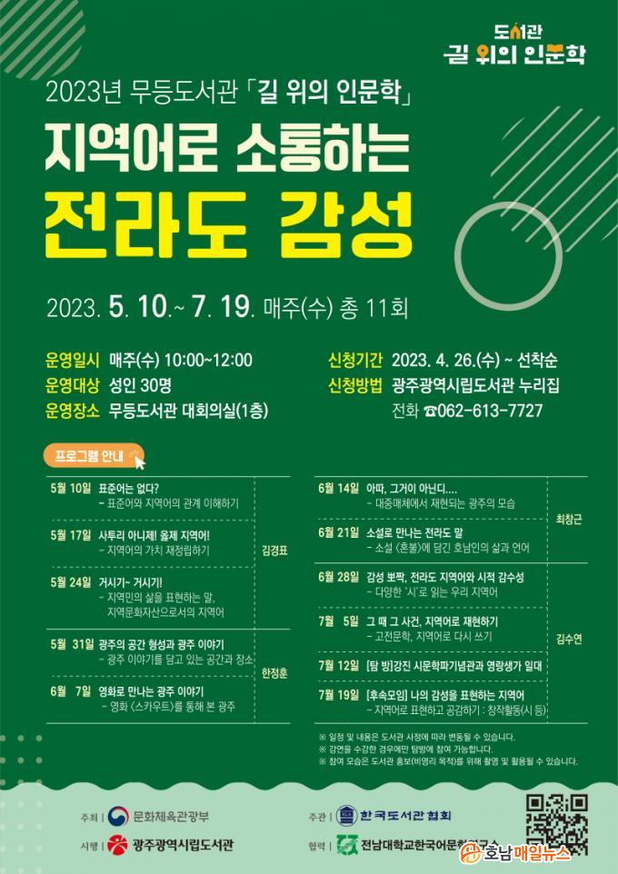 ¡®Áö¿ª¾î·Î ¼ÒÅëÇÏ´Â Àü¶óµµ °¨¼º¡¯À» ÁÖÁ¦·Î ¿¸®´Â Àι®ÇÐ ÇÁ·Î±×·¥Àº 5¿ù 10ÀϺÎÅÍ 7¿ù 19ÀϱîÁö ¸ÅÁÖ ¼ö¿äÀÏ ÃÑ 11ȸ¿¡ °ÉÃÄ ÁøÇàµÈ´Ù.