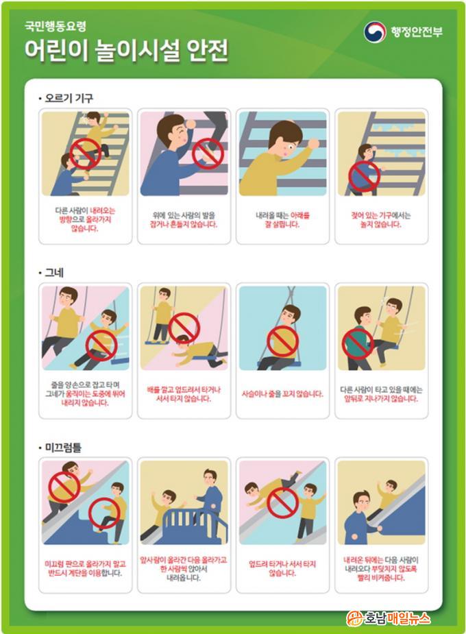 ³îÀ̱ⱸ¸¦ ÀÌ¿ëÇÒ ¶§´Â ²öÀÌ ´Þ¸° ¿ÊÀ̳ª ½½¸®ÆÛ µîÀ» Âø¿ëÇϰųª Àå³°¨ µîÀ» ¼ÒÁöÇÏÁö ¾Ê°í, ³îÀ̱ⱸº° ¾ÈÀü¿ä·ÉÀ» Àß ÁöÄÑ¾ß ¾ÈÀü»ç°í¸¦ ¿¹¹æÇÒ ¼ö ÀÖ´Ù. ¶Ç, ¿µÀ¯¾Æ´Â ³îÀ̸¦ ¸¶Ä¥ ¶§±îÁö º¸È£ÀÚÀÇ µ¿¹Ý ÇÏ¿¡ º¸È£¡¤°üÂûÀ» ¹Þ¾Æ¾ß ÇÑ´Ù.