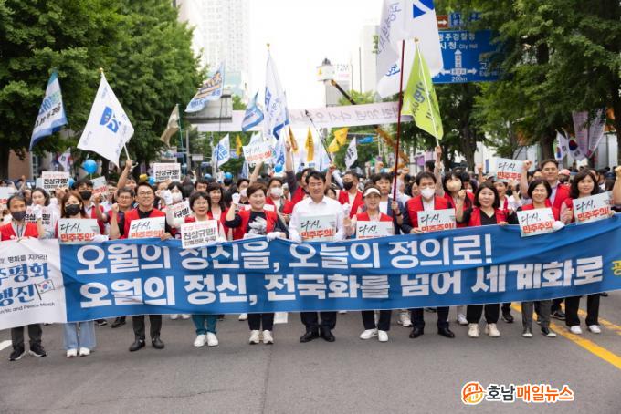 ÀÌÁ¤¼± ±³À°°¨À» ºñ·ÔÇÑ ½Ã±³À°Ã» Á÷¿øµéÀº ¼öâÃʵîÇб³¿¡¼ ÀüÀϺôµù±îÁö À̾îÁø ¡®¹ÎÁÖÆòÈ´ëÇàÁø¡¯¿¡ ÇÔ²²Çß´Ù. À̵éÀº ¡®¿À¿ùÀÇ Á¤½ÅÀ», ¿À´ÃÀÇ Á¤ÀÇ·Î! ¿À¿ùÀÇ Á¤½Å, Àü±¹È¸¦ ³Ñ¾î ¼¼°è·Î¡¯, ¡®´Ù½Ã ¹ÎÁÖÁÖÀÇ!¡¯ µî Ç÷¡Ä«µå¿Í ÇÇÄÏ µîÀ» µé°í, 5¡¤18 ¹ÎÁÖȿÀÇ ¿ÏÀüÇÑ Áø»ó±Ô¸í°ú Çå¹ýÀü¹® ¼ö·ÏÀ» Ã˱¸Çß´Ù.