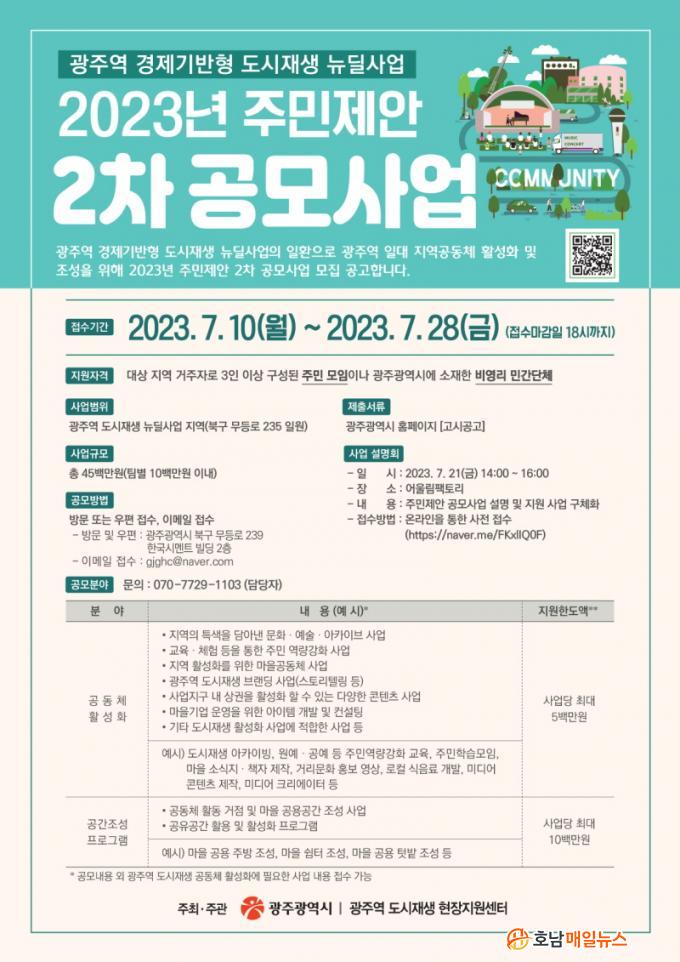 ¡®±¤ÁÖ¿ª µµ½ÃÀç»ý ÁÖ¹ÎÁ¦¾È °ø¸ð»ç¾÷¡¯Àº ±¤ÁÖ¿ª µµ½ÃÀç»ý ±Ç¿ª ³»¿¡¼ ÁÖ¹ÎÀÌ ÁÖü°¡ µÇ¾î µµ½ÃÀç»ý »ç¾÷À» ¹ß±¼ÇÑ´Ù. ±¤ÁÖ¿ª °æÁ¦±â¹ÝÇü µµ½ÃÀç»ý ´ºµô»ç¾÷À» ÃßÁøÇϰí ÀÖ´Â ±¤Áֽô ±¤ÁÖ¿ª ÀÏ´ë Áö¿ª°øµ¿Ã¼ Ȱ¼ºÈ, ÄÜÅÙÃ÷ »ç¾÷ ¹ß±¼, °øÀ¯°ø°£ Á¶¼ºÀ» À§ÇØ À̹ø °ø¸ð»ç¾÷À» ¸¶·ÃÇß´Ù.