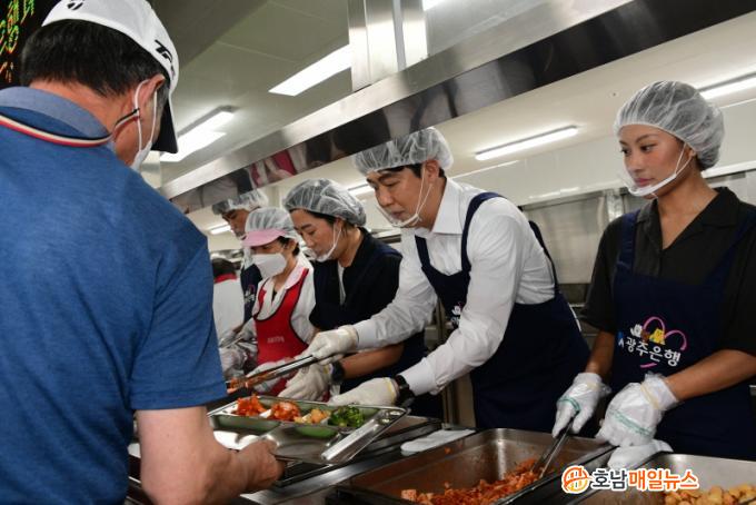 À̳¯ ¹è½Ä ºÀ»ç¿¡´Â À̱ͼø ºÎÀÇÀåÀ» ºñ·ÔÇÑ ½ÃÀÇ¿ø 15¸í°ú °íº´Àϱ¤ÁÖÀºÇàÀå, ±¤ÁÖÀºÇà È«º¸´ë»ç µî 30¿©¸íÀÌ ÇÔ²² Çß´Ù. ¹«´õÀ§°¡ ¿¬ÀÏ À̾îÁö´Â °¡¿îµ¥ ±¤ÁÖ½ÃÀÇȸ¿Í ±¤ÁÖÀºÇàÀº ³ëÀΰǰŸ¿îÀ» ãÀº ¾î¸£½Åµé¿¡°Ô »ï°èÅÁÀ» ´ëÁ¢Çß´Ù. »ï°èÅÁ ¹è½Ä ÈÄ¿¡´Â °úÀÏ, À½·á¼ö, ºÎä µîÀ» Àü´ÞÇÏ¸ç ¾î¸£½ÅµéÀÇ °Ç°ÇÑ ¿©¸§³ª±â¸¦ ÀÀ¿øÇß´Ù.