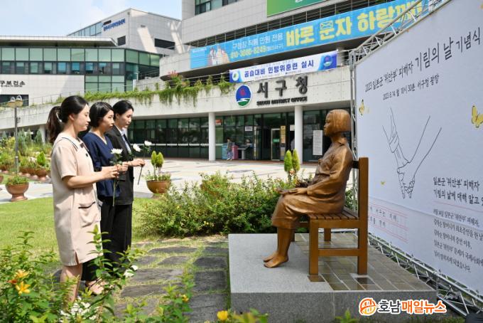 [È£³²¸ÅÀÏ´º½º = ±è±Ý´ö ±âÀÚ] ±èÀ̰ ±¤ÁÖ ¼±¸Ã»Àå°ú °£ºÎµéÀº 14ÀÏ ¿ÀÀü ¼±¸Ã» ±¤Àå¿¡ ¼³Ä¡µÇ¾î ÀÖ´Â ¡®ÆòÈÀÇ ¼Ò³à»ó¡¯ ¾Õ¿¡¼ 'ÀϺ»±º À§¾ÈºÎ ÇÇÇØÀÚ ±â¸²ÀÇ ³¯' Çà»ç¸¦ °³ÃÖÇϰí ÇÇÇØÀÚÀÇ ¸í¿¹¿Í ÀÎ±Ç È¸º¹, ¿Ã¹Ù¸¥ ¿ª»çÀÇ½Ä °íÃ븦 À§ÇØ ³ë·ÂÇÒ °ÍÀ» ´ÙÁüÇß´Ù.