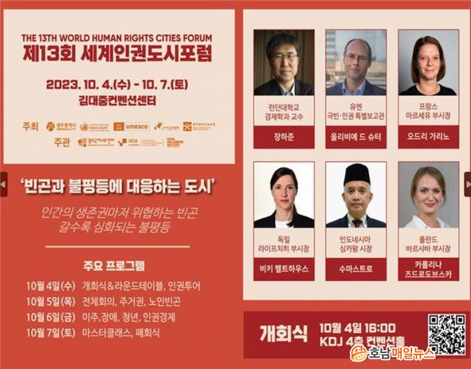 ±¤ÁÖ±¤¿ª½Ã(½ÃÀå °±âÁ¤)´Â À¯¿£ ÀαÇÃÖ°í´ëÇ¥»ç¹«¼Ò, À¯³×½ºÄÚ, ±¹°¡ÀαÇÀ§¿øÈ¸, ±¤Áֽñ³À°Ã»°ú °øµ¿À¸·Î ¿À´Â 10¿ù 4ÀϺÎÅÍ 7ÀϱîÁö ±è´ëÁßÄÁº¥¼Ç¼¾ÅÍ¿¡¼ ¡®Á¦13ȸ ¼¼°è Àαǵµ½ÃÆ÷·³¡¯(ÀÌÇÏ ±¤ÁÖÆ÷·³)À» °³ÃÖÇÑ´Ù. ¿ÃÇØ ÁÖÁ¦´Â ¡®ºó°ï°ú ºÒÆòµî¿¡ ´ëÀÀÇÏ´Â µµ½Ã(Human Rights Cities Responding To Poverty And Inequalities)¡¯ÀÌ´Ù.