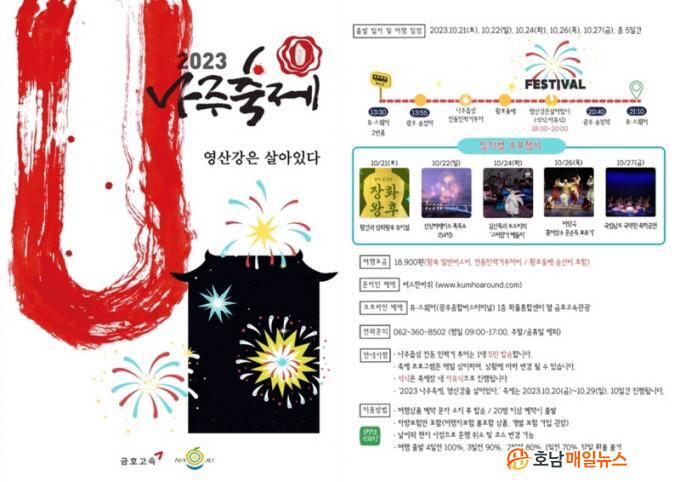 ¿µ»ê° ¼±»ó ÆÛ·¹À̵å, ¹ÂÁöÄà °³¸· °ø¿¬ µî ÃàÁ¦ ¸ÞÀÎ ÇÁ·Î±×·¥ °ü¶÷¡¤Ã¼Çè°ú ÇÔ²² °ü±¤°´µé¿¡°Ô ³ªÁÖÀÇ ¿ª»ç¡¤¹®È, Èú¸µ °ø°£À» µÑ·¯º¼ ¼ö ÀÖ´Â ¿©Çà ±âȸ¸¦ Àú·ÅÇÑ °¡°Ý¿¡ Á¦°øÇÒ °èȹÀÌ´Ù. ¿î¿µ ±â°£Àº 10¿ù 21, 22, 24, 26, 27ÀϱîÁö ÃÑ 5ÀÏÀÌ´Ù. ¿©ÇàÄÚ½º´Â ´çÀÏ 13½Ã 30ºÐ ±¤ÁÖÀ¯½ºÄù¾î 2¹øÈ¨(±¤ÁÖÁ¾ÇÕ¹ö½ºÅ͹̳Î)¿¡¼ ž½Â¡¤Ãâ¹ßÇØ ±¤ÁÖ ¼ÛÁ¤¿ª(13½Ã 55ºÐ)À» °ÅÃÄ ³ªÁÖÀ¾¼º Àüµ¿Àη°ÅÅõ¾î, ȲÆ÷µÀ¹è ž½Â üÇè, ³ªÁÖÃàÁ¦ ÇöÀå(¿µ»ê°µÐġüÀ°°ø¿ø) ¹æ¹® ¼øÀ¸·Î ÁøÇàµÈ´Ù.
